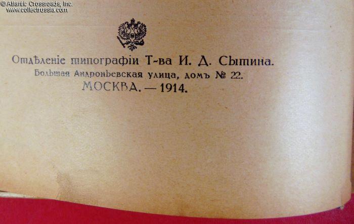 Measures approx. 8" x 6", 270 pp., hardcover, illustrated. Russian text. Printed in pre-reform Russian orthography containing currently obsolete letters. Published by I. Sytin & Co. Publishing, Moscow. Rare for this period, the front cover graphic is a lithograph in full color, signed by the artist in the bottom right corner. As stated in fine print at its bottom, it was made in 1913 in the I. Sytin & Co. Lithography Shop in Moscow. The back cover features a list of other fairy tales and fables published by Sytin & Co. Each tale is illustrated with at least one b/w lithograph, most of