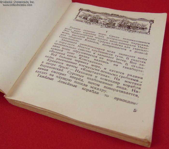 Small format, 5 ½" x 4 ¼", 143 pp. Paperback. The title page features a hand-written gift inscription reading "From Grateful N. Vorin". Russian text, with Admiral Nakhimov's photo portrait. The genre is defined as historic novella. The novella depicts the last few years of the admiral's heroic career as a naval commander, glorifying his talent, the ultimate respect and love he commanded among his underlings, from senior officers to the last sailor. The novella ends with his tragic death by the enemy's bullet and - a dead giveaway that this book had been ordered by the propaganda department of the Navy or some other branch of the Soviet government - this parting phrase: "Flying in the wind is the flag of the Soviet Navy".