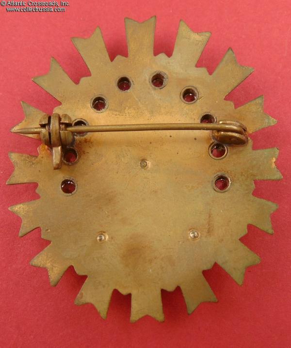 In excellent condition. The enamel is essentially perfect, completely free of any chips, flaking, or hairline fractures typically found on this decoration. There are only some microscopic contact marks invisible without magnification, no significant wear to enamel. There is only a mild tarnish to the tips of the starburst, not detractive and actually adding character. A good amount of the original gilt finish is visible in recessed areas of the starburst and on the reverse under the pin. Note that at least in theory, this piece may be considered the 1st class of the order: the difference between the 1st and 3rd class was only in the amount of gold finish that would usually rub off in any case with the passage of time. A very impressive piece.