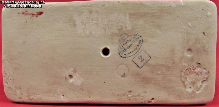Measures approx. 8 ¼" x 5 ½" x 2 ½", in glazed porcelain. A young Female Marksman peers downrange at her target. The statuette's listing can be found on p. 161 of Soviet Porcelain 1917 - 1991: Illustrated Catalog with Manufacturer Marks and Prices by I. Pelinskiy and M. Safonova (see our last photo). This iteration of the maker's mark of the Gorodnitsa Porcelain Factory was in use from mid-1920s to 1934 (#139 in Volume One of Marks on Soviet Porcelain, Faience, and Majolica, 1917-1991 by Nasonova et al.)