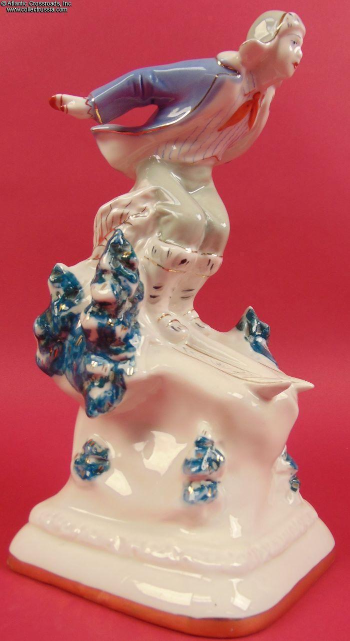 Rather large, stands approx. 9 ¾" tall, the plinth is 5" x 4 ½". Weighs almost 2 lbs. A boy wearing the Young Pioneers red tie is enjoying a fast ski ride downslope. The model was made by sculptor S. Orlov in 1954. This particular figurine stands out from other casts of this model. First, the sculptor's name and year are on the back. Also, it has an interesting artistic feature not present in other casts. If you look closely at the little fur trees, you will see that the glaze has not been applied in most of their creases, enhancing the 3D effect of their volume. The statuette is maker marked on the bottom. This iteration of the graphic was in use from 1954 to 1970 (#183 in Volume One of Marks on Soviet Porcelain, Faience, and Majolica, 1917-1991 by Nasonova et al.). Green color indicates 3rd quality rating. The statuette's listing can be found on p. 300 of Soviet Porcelain 1917 - 1991: Illustrated Catalog with Manufacturer Marks and Prices by I. Pelinskiy and M. Safonova (see our last photo). Note that the price tag "From $250" is for the Russian market as of the year of the catalog's publication, 2012-13.