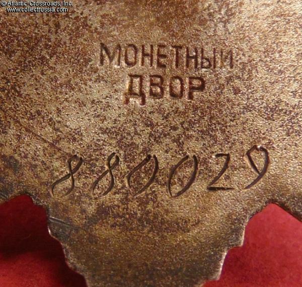 Silver, 14 K gold (hammer & sickle emblem), enamels. Measures 46.1 mm in height, 43.8 mm in width; weighs 27.2 g without the screw plate. Features flat reverse, horizontal mintmark on two lines struck by a single stamp, and serial number without underline. According to Mondvor.narod.ru classification, this piece is Leningrad Mint Variation 5 Sub-variation 1, the first series of the post-war Leningrad Mint "flat backs" produced in the 1950s (its currently known serial number range is 877526 - 919315).