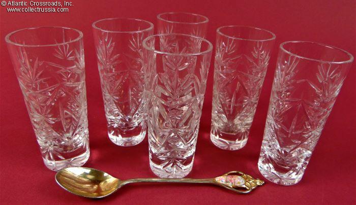 Set of 6 Tall Cut Crystal Vodka Shot Glasses, circa 1970s-80s.