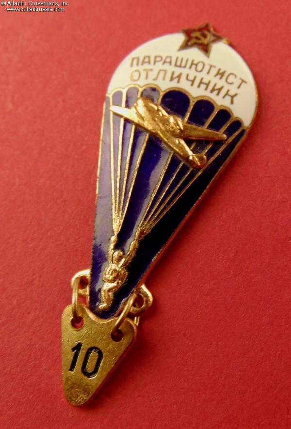 The badge is in very fine overall condition. The obverse is perfect. The enamel is pristine and shows beautiful luster. The gilt finish is bright throughout, completely free of tarnish. The pendant for 10 / 25 jumps is a replacement that came off of a 1970s-80s badge, but its shape and design are the same as the original. The screw post has been shortened as was customary, but its remaining length of over 6 mm is enough to accommodate the screw plate and provide proper functionality. The badge includes an original period screw plate marked "Pobeda Factory, Moscow".