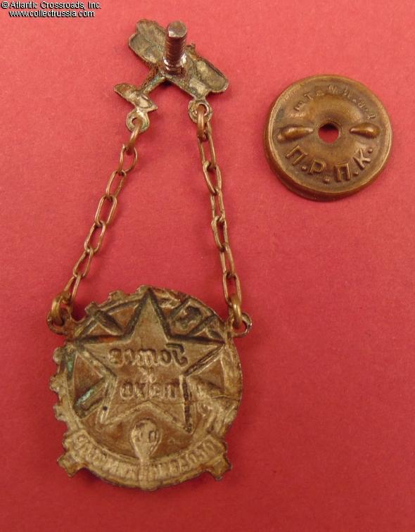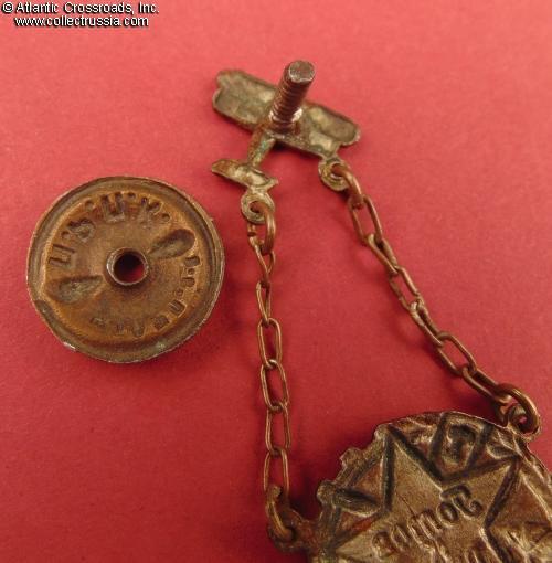 In excellent condition. The enamel is essentially perfect, having only a few microscopic contact marks and manufacturing flaws invisible to the naked eye, completely free of significant wear. The raised details are extremely well preserved and crisp. The suspension chains are original and complete. The screw post of the suspension is of full length, well over 8.5 mm. The screw post is of full or near full length, approx. 8 mm. Comes with a screw plate marked "PRPK Stamping Factory" which is of the period, fits the screw perfectly, and may be original to the badge.