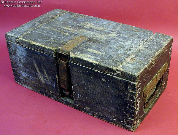 Measures 7 ¾" x 6" x 14 ½". One steel handle, one steel hasp. No stenciling, no intact paper labels.