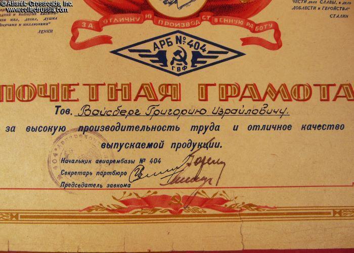 Achievement Certificate issued to aircraft repairman Grigoriy Vaisberg (Григорий Израилевич Вайсберг) for excellent productivity and quality of work, circa late 1930s.