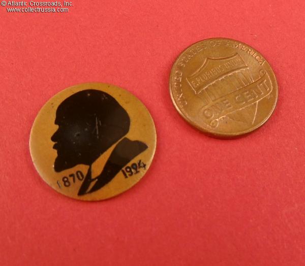 Copper, enamel; 19.7 mm wide; weighs 2.8 g without the screw plate, 4.2 g overall. Shows black silhouette of Lenin with the dates of his life "1870-1924".