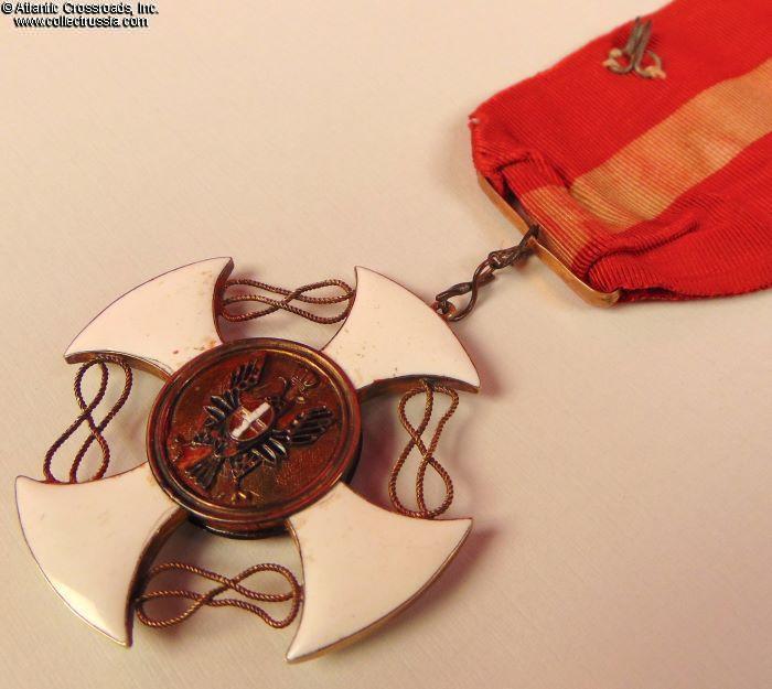 In gilded metal, possibly with solid gold parts (not tested for gold content) and enamels; measures 53.1 mm in height (incl. eyelet), 50.1 mm in width, weighs 17.5 g. The neck ribbon looks to be original, and apparently has been modified by the recipient to wear the award on another collar.