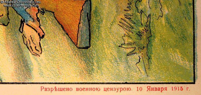 Large 16 ½" x 24 ¼" lithographic print in the lubok style, popular in Russia at the time. The artist's name, Alexander Noskov, is in the lower right-hand corner. Published by I. Mashistov Printing and Lithography Partnership. As evidenced by the inscription in red at the bottom of the left margin, the print was approved by military censure on 10 January, 1915 by the Julian calendar then in use in Russia, or 23 January by the Gregorian calendar used today.