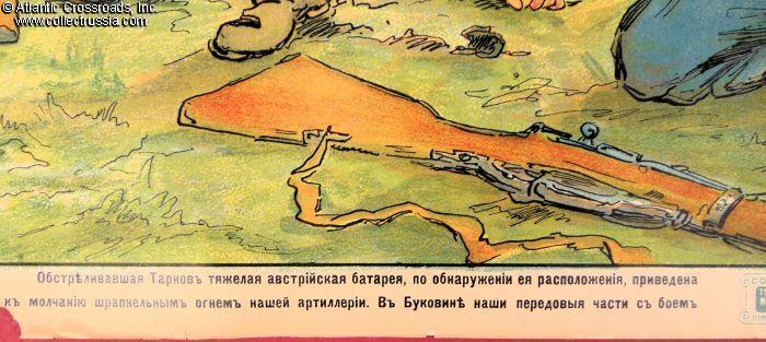 During WW1, lubok prints - colorful illustrations of an event, often accompanied by descriptive text - provided Russians with visual interpretations of events on the frontlines, and were widely used as a propaganda tool to bolster morale. The episode depicted in this lithograph took place around 3 January 1915 (16 January by the Gregorian calendar). On January 2nd, Russia began a major offensive against Austria-Hungary in the Carpathians as part of the general plan to strengthen its flanks in Galicia before driving further westward toward Silesia. While later than winter Russia's preparations in the north of the Eastern Front to advance into East Prussia were thwarted by Ludendorff striking eastward and enveloping four Russian divisions in the Augustow forests, the Russian army continued to press forward in the south, in Galicia, culminating in the capture of Przemyśl in late March.