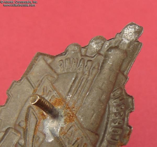 In silver-plated steel and "cold" enamel, 39.9 x 30.8 mm, weighs 2.1 g. Stamped out of a very thin, almost foil-like sheet of steel, this piece has a "tinny" quality characteristic of some of the earliest Soviet propaganda and labor award pins and jettons. The artwork shows a strong influence of the Constructivist style popular in the 1920s but largely phased-out by the end of the 1930's decade. The inscription on the red scroll is "Shock-Worker"; the numeral "4" signifies the goal of completing the assignments of the Five-Year Plan within four years. The raised inscription alo