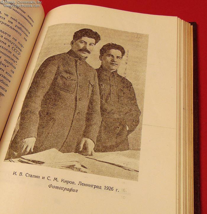 Measures 5 ¼" x 8", paper-laminated hard cover, 216 pp., published by the Publishing House of the Bulgarian Communist Party, illustrated with multiple photos and drawings of Stalin, alone or with other leaders of the Communist Party and Soviet government, including a full-page portrait with his facsimile. It is remarkable that even though the title page states that this is just a translation of the second edition of Stalin's brief biography, the Russian original of which was published in 1947 in a book of the same format, the Bulgarian translation is twenty-seven pages shorter! Either B