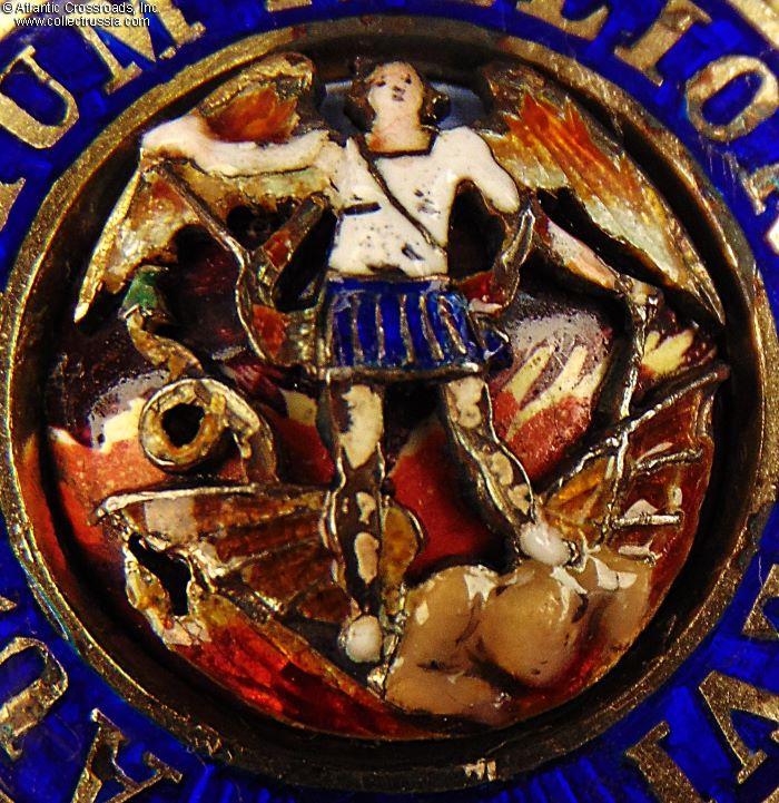 Silver gilt, enamels, 67.9 mm (H) incl. the eyelet x 48.7 mm (W), weighs 28.2 g including the jump ring and suspension loop. The obverse center medallion features a finely sculpted scene of St. Michael standing victorious on the prone figure of Satan. The reverse center medallion shows St. George slaying the dragon, also finely sculpted and in high relief. The blue enameled ring on both center medallions features the motto of the order in Latin, AUSPICIUM MELIORIS AEVI ("Token of a Better Age").