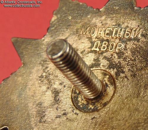 In solid Sterling silver (925/1000 silver content) with gold plating and enamels, 46.4 mm tall x 44.1 mm wide; weighs 27.2 g not including the screw plate. Variation featuring a well-defined depression around the screw post. Note the serial number which is very low for a 1985 issue and especially in 2nd class.