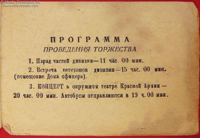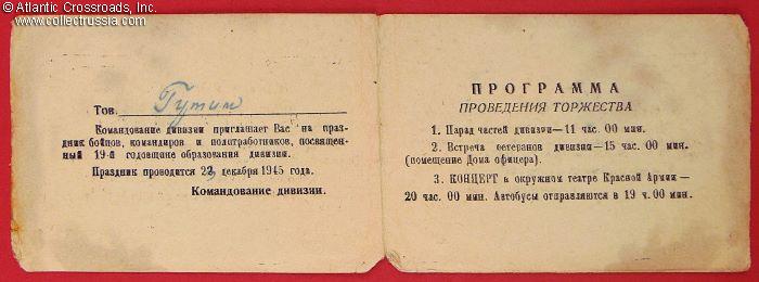 In folder format measuring 4 ½" x 3" when closed. The front cover features the full name of the division including all the honorifics it had been awarded with by the end of WW2: 1st Guards Moscow-Minsk Order of Lenin, Order of the Red Banner, Order of Kutuzov Rifle Division. Inside, the left page bears the name of the invitee, Gutin, and the invitation issued by the divisional command for the celebratory events scheduled for 23 December 1945. The right-side page lists the events: parade, meeting of the veterans, and a gala concert.