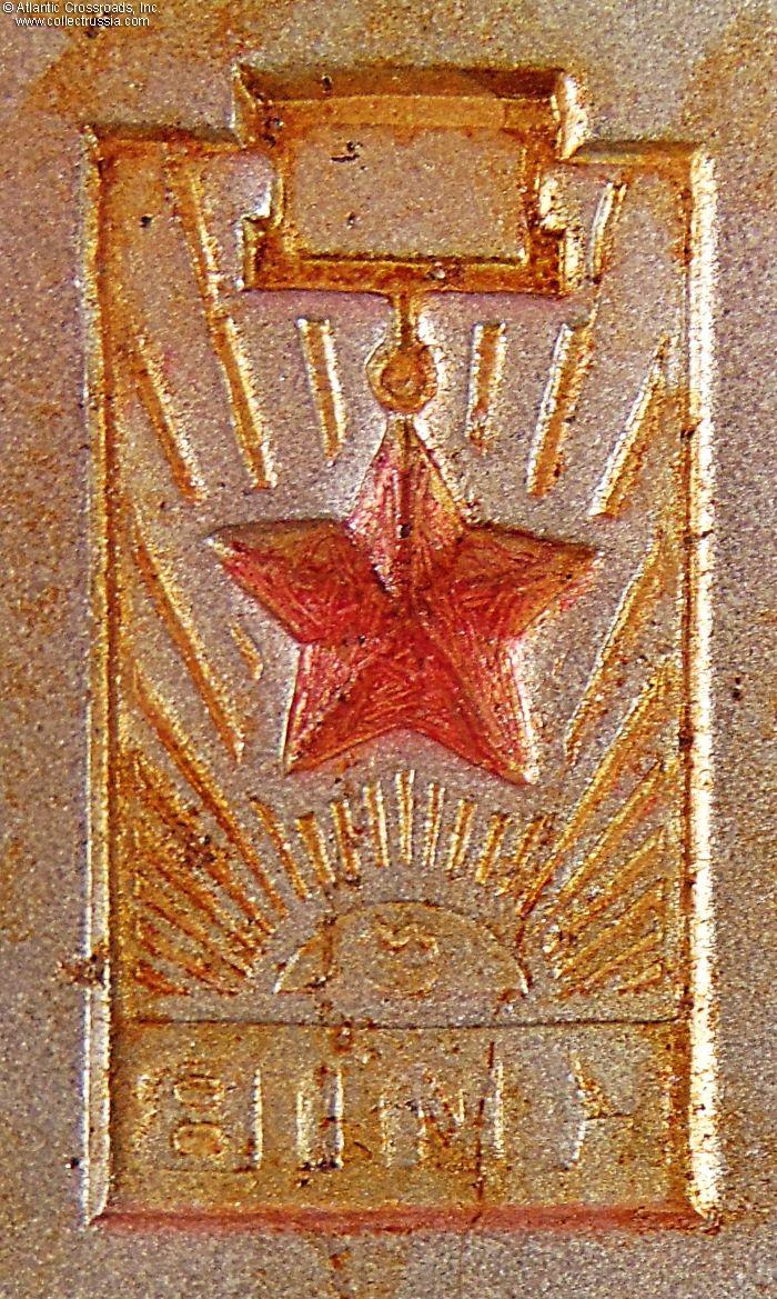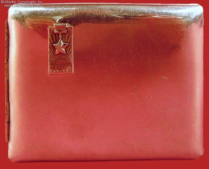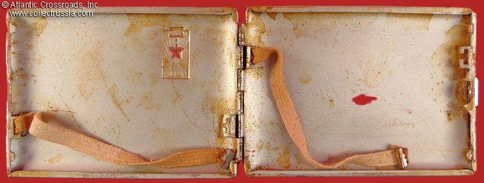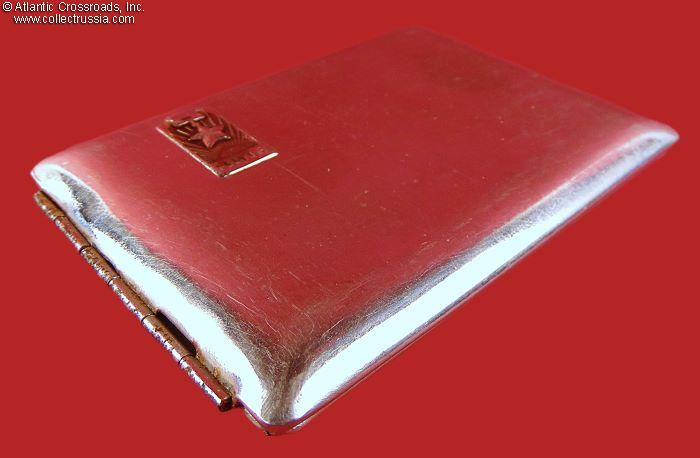In chromed steel, measures approx. 108 x 78 x 13 mm. The hinge is on the short side. The case features smooth unadorned surface with just one piece of artwork: a small rectangle with the Hero of the Soviet Union star against the background of the rising sun and the name of the city, "КИIВ" underneath, in Ukrainian.