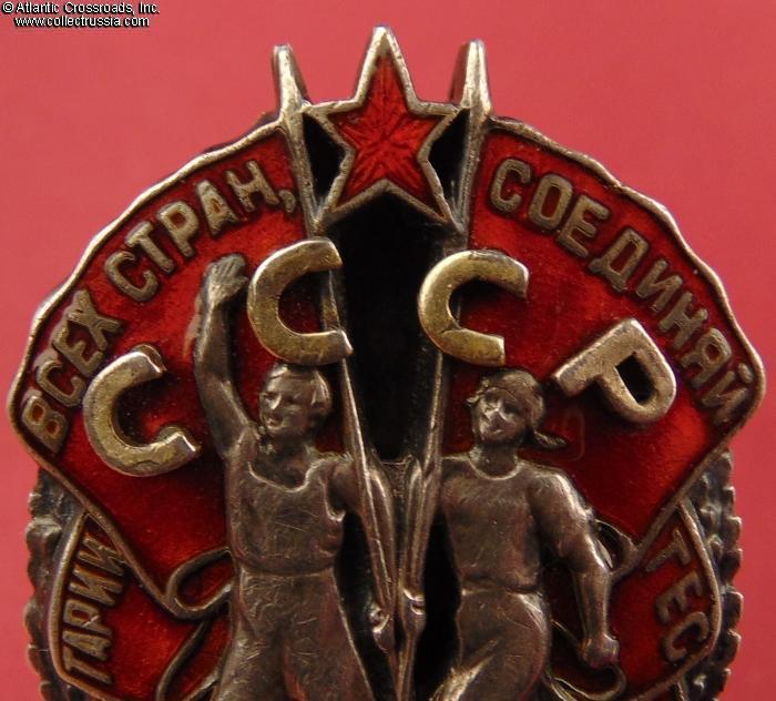 In excellent condition, nearly unheard of for the "Small" Type 1 Badge of Honor. The enamel in particular is exceptionally well-preserved: it is completely free of any wear visible to the naked eye, shows a magnificent luster, and has only a few microscopic contact marks and flakes that are invisible without magnification. The letters "CCCP" are original, have much of their original gilt still present, and are tightly attached by the original pins. The raised details of the male and female workers are nicely preserved and crisp, nearly pristine.