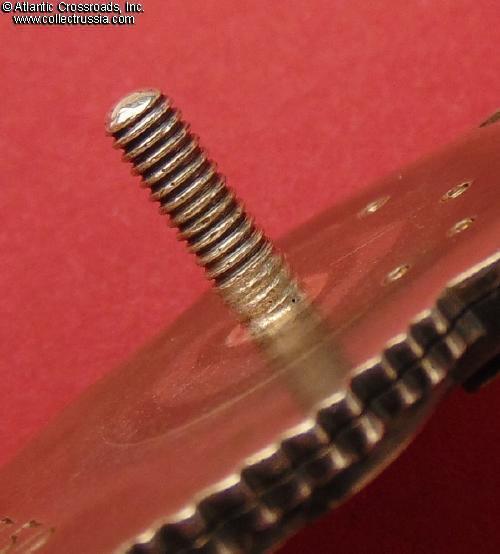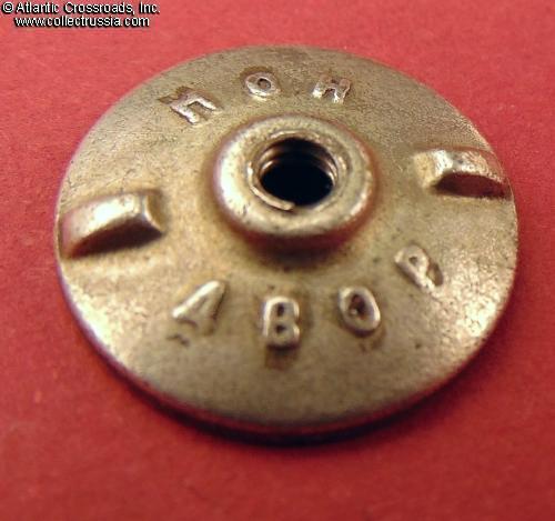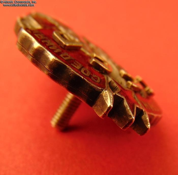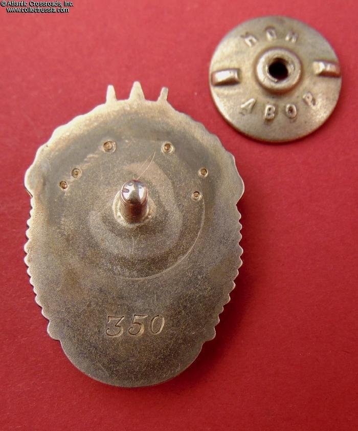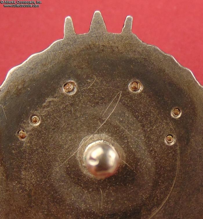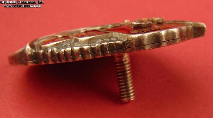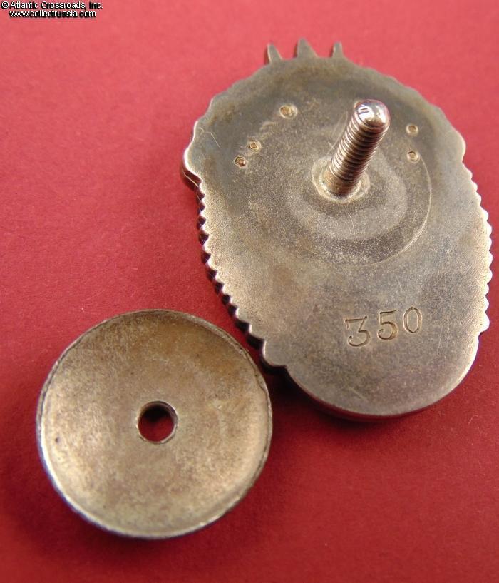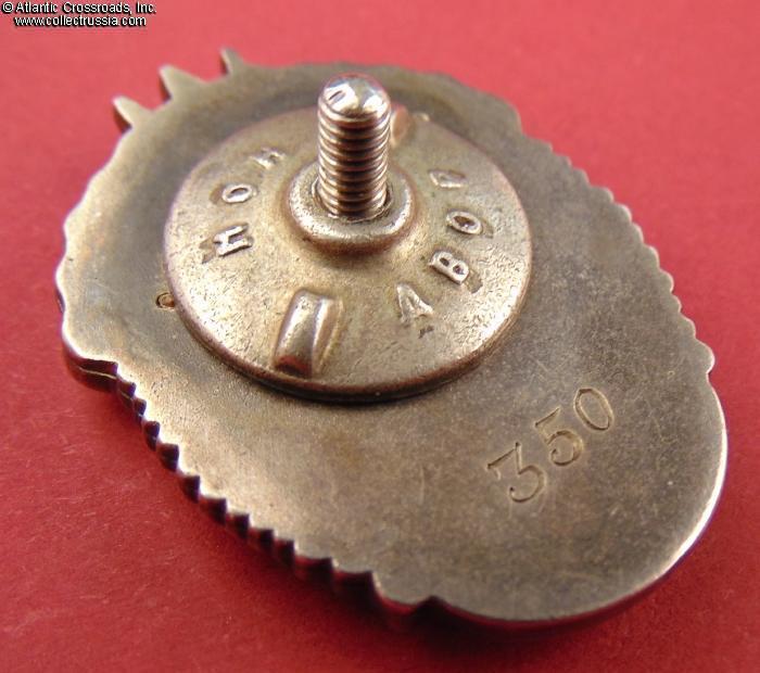 Silver gilt, enamels. Measures 38.6 mm in height, 27.9 mm in width; weights 22.4 g without the screw plate. Riveted multi-piece construction (each letter in the "CCCP" is attached by copper pins). The serial number is engraved in very large numerals, in the manner characteristic of the Type 1 Var. 2.
