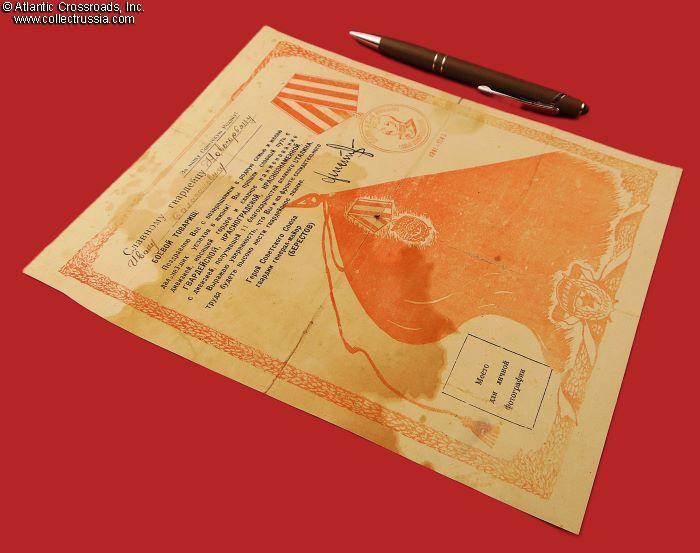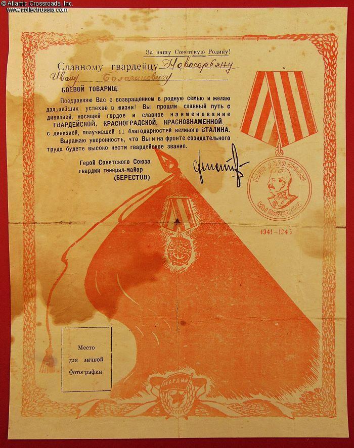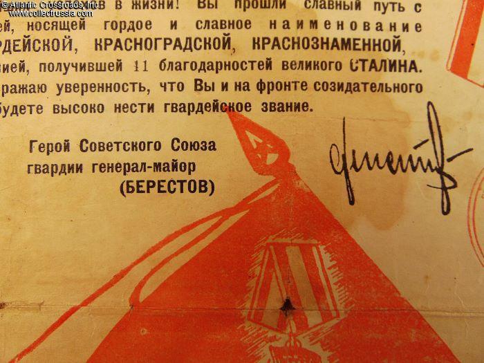 Single page 7 ½" x 9 ½", front only. Issued to Ivan Novosorbyan, a serviceman in the 72nd Guards Rifle Division, and hand-signed by the division commander Major General Pyotr Berestov (Петр Филиппович Берестов).