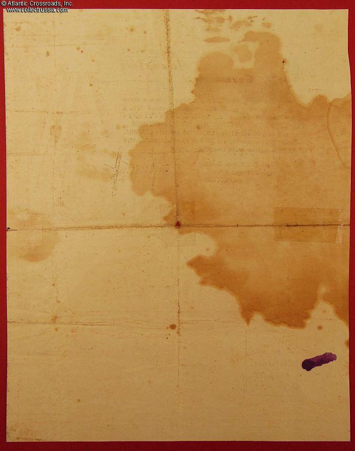 In good to very good condition: the partial separations in the horizontal fold have been reinforced with clear tape on the verso; the paper is pliant and does not feel brittle. Despite the large stain, the handwritten and typographical text as well as Berestov's signature are vibrantly bright, crisp and perfectly legible.