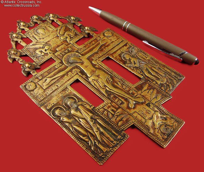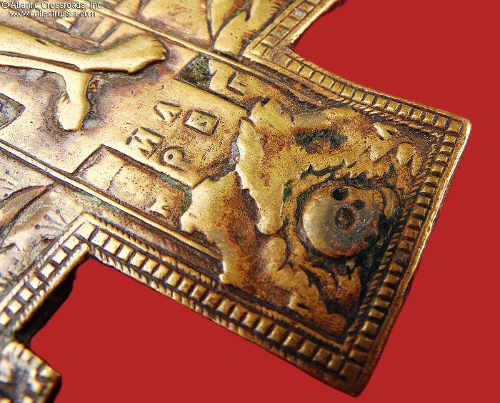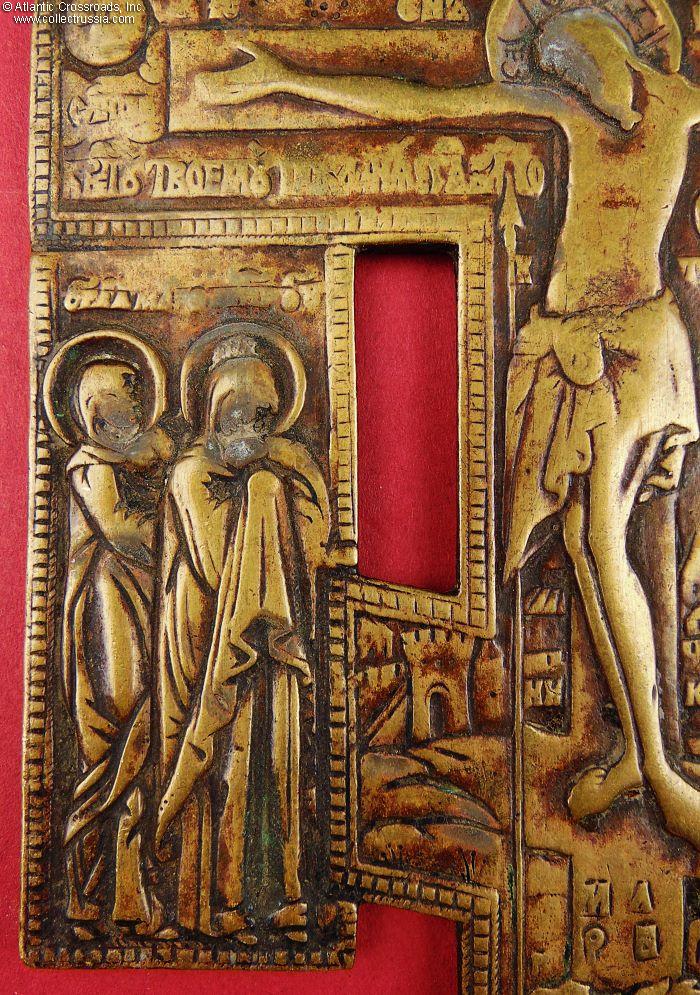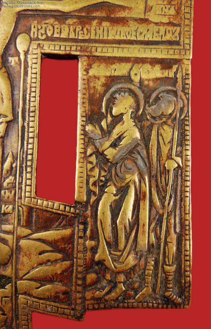 The icon is in good condition. There is moderate wear to the high points of the artwork, but the details of the writing, cityscape, clothes, and even some of the facial features are still well defined. The paint, originally bringing out the relief of the metalwork, is 50-70% worn off but is still quite evident. One shallow dent at the very bottom is not too obvious or detractive. Overall, an impressive classic icon. The loop for hanging the cross on the wall is original and in perfect condition.