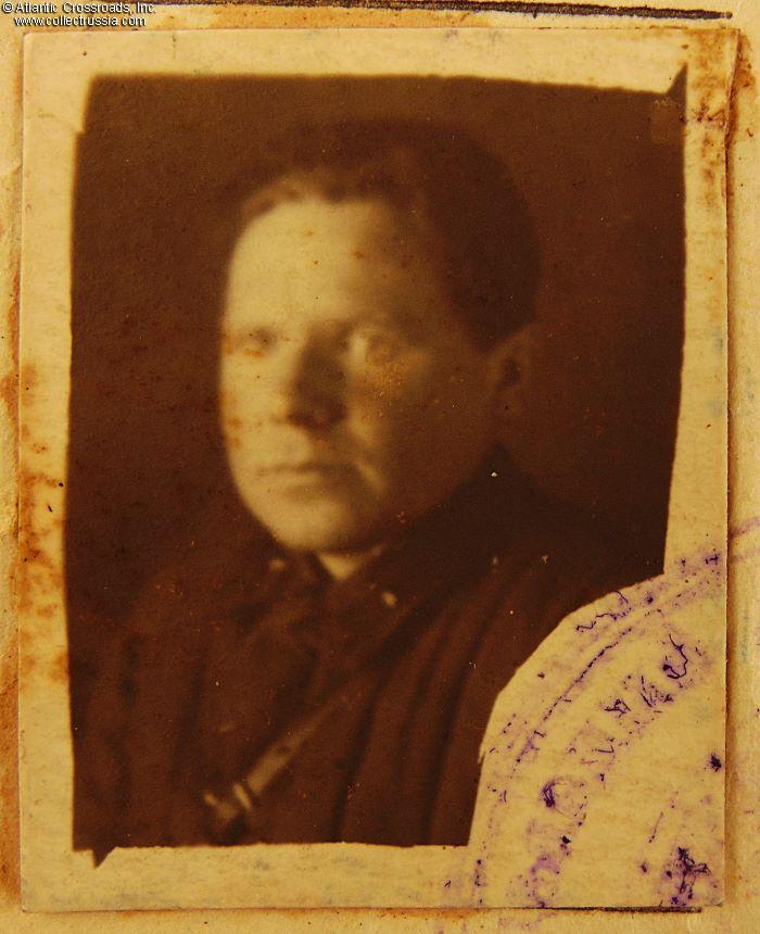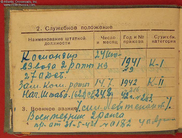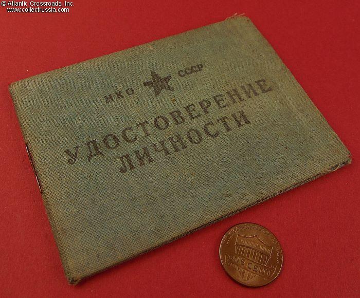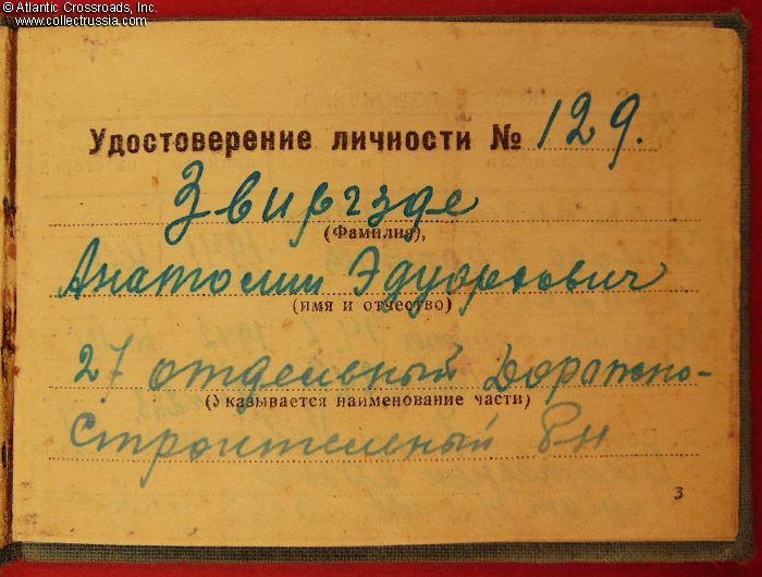 In booklet format measuring 4" x 3", in oilcloth-wrapped hard cover. The lettering on the front cover reads "NKO (Narkomat of Defense) of the USSR, Identification Card." The ID photo inside is validated by the ink stamp of the 27th Separate Road Construction Battalion and the hand signatures of its commander and chief of staff, predecessor of Zvirgzde who was appointed to this post on 24 August 1942. The ID lists his date and place of birth (1911, Kiev), positions with the 27th Battalion, military rank, marital status (married), and the issued firearm - a Nagant revolver.