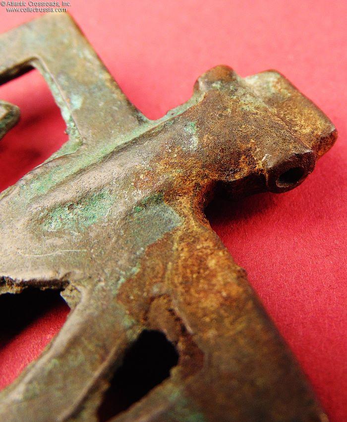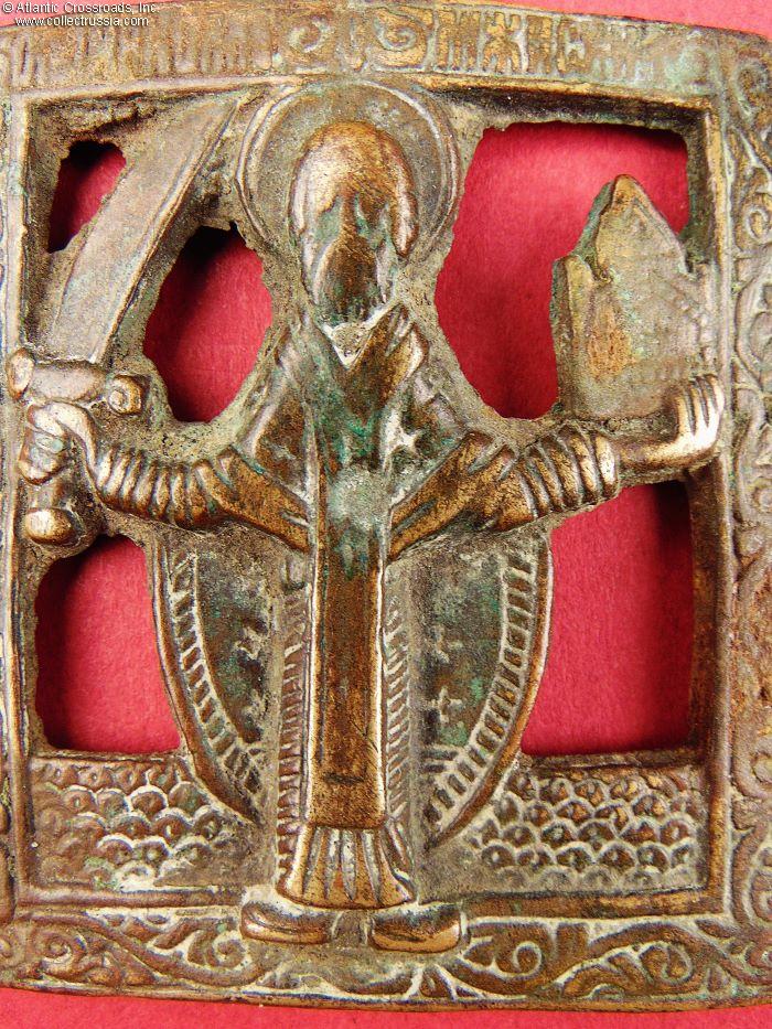 In bronze, 3" in height (incl. suspension) x 2" in width, weighs a little over 2 oz. The icon portrays one of the most venerated saints in the Russian Old Believers' pantheon, Saint Nicholas, patron of the persecuted.