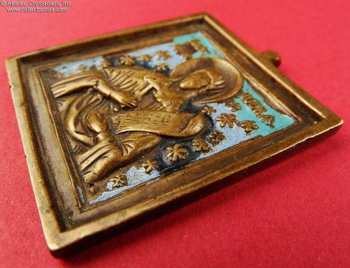In bronze & enamels, 2 ¼" x 2". The icon depicts Saint Paraskeva, aka Paraskeva Friday. In Russian Orthodox tradition, Paraskeva is considered a virgin martyr who was born to a rich family of Iconium (modern-day Konya in Turkey). Her parents were Christian and gave her the name Paraskeva which in Greek means Friday, the day she was baptized. According to tradition, Paraskeva converted a man named Antoninus to Christianity. She was subsequently martyred at Iconium during the persecutions of Diocletian, the Roman emperor of the late 3rd - early 4th century. Among the Russian Orthodox peasantry, she was venerated as protector of women, marriage, homestead, and farm animals.