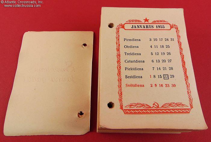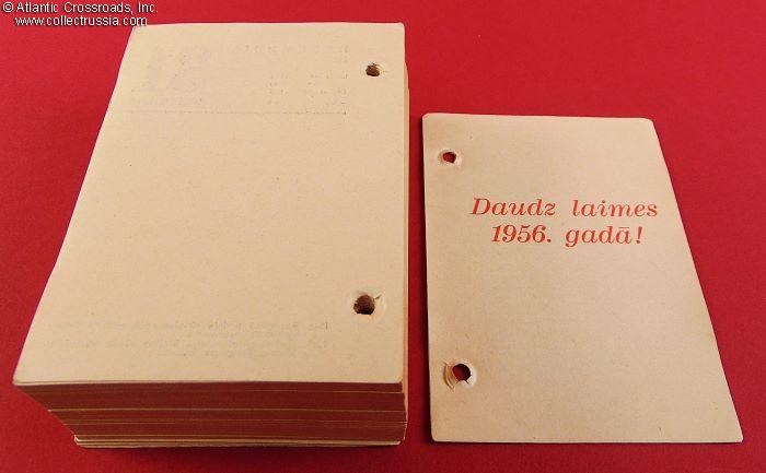 Measures 3 ½" x 5" x 1 ½", published by Latvijas Valsts Izdevnieciba ("Latvian State Publishing House"), Riga, circulation 50,000. Such desk calendars were popular in office environments, stacked on special slanted stands with inverted U-shaped metal rods affixed to the usually plastic platform. The pages of the calendar would then be turned from the right to the left side of the platform. The blank space on the verso of each page was meant for notes.