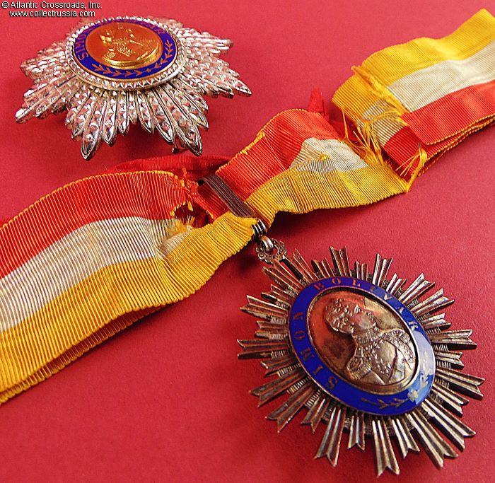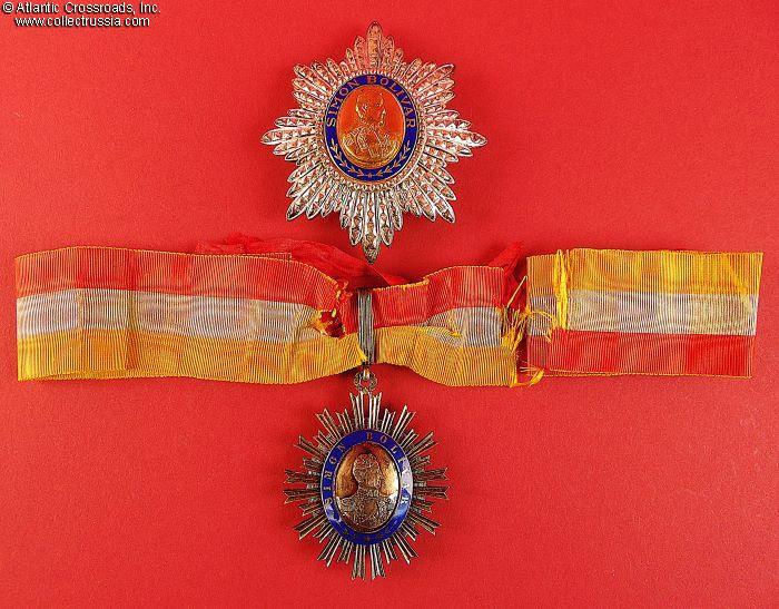Neck badge with ribbon. Silver gilt, enamel, 62.3 mm in height (incl. eyelet), 50.1 mm in width, weighs 38.1 g. The bust of Simon Bolivar in the center medallion is in silver on silver gilt background, encircled by his name in gold on blue enamel. The center medallion on the reverse features the coat of arms of Venezuela, superimposed on a silver gilt background, resting on a ribbon inscribed with "15 DE AVRIL 1810 LIBERTAD 5 DE JULIO 1811." The badge is in very fine to excellent condition, showing mild attractive patina to the metal and a tiny spot of probably glue on the blue enamel at 12:05 o'clock, visible only when tilting the badge to reflect a bright light. The neck ribbon is moiré silk, 18.5" long with silk ties. It is rather frail, especially in its middle part, and shows a hole to the left of the suspension loop. About 2" to the right of the loop, there is a complete tear across the ribbon. The ribbon's condition makes it unfit for wearing but it will display nicely, properly arranged.