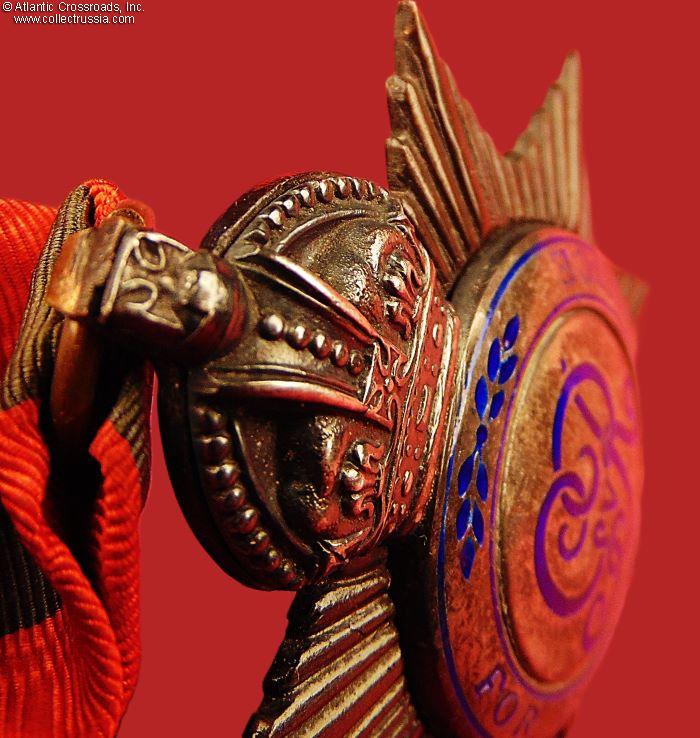 In excellent condition. The obverse of the badge shows very attractive patina but no apparent scuffing. The blue enamel is intact and wear-free. The obverse shows mild scuffing and an occasional shallow scratch, not too obvious or detractive. The ribbon is perfectly clean and free of any damage to the silk.