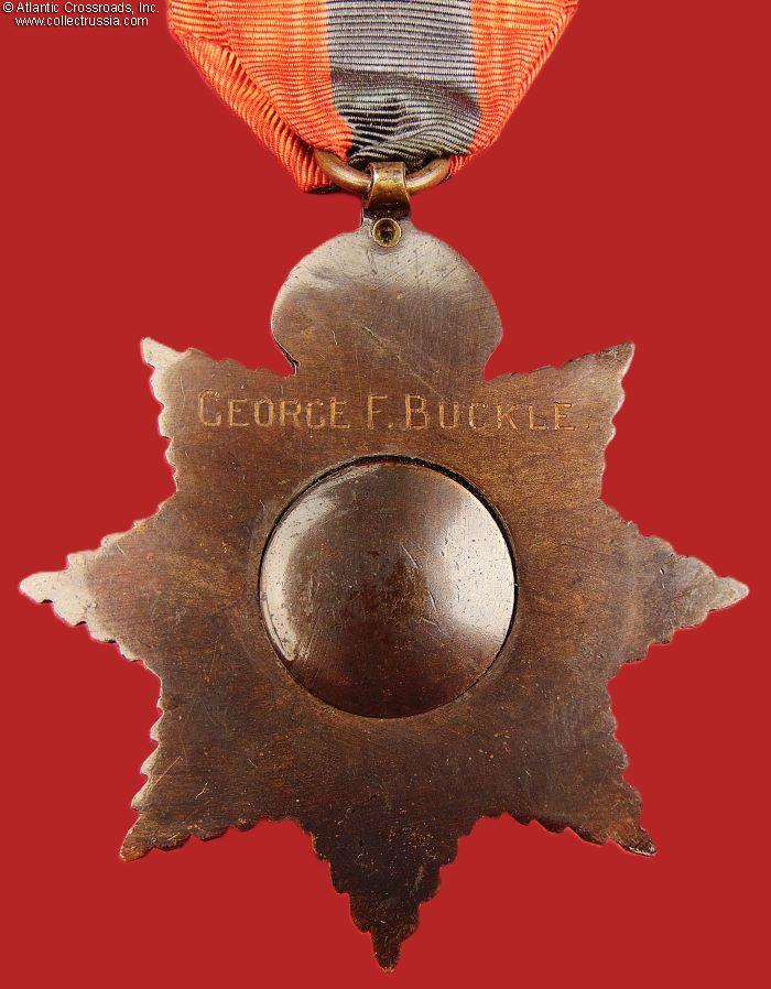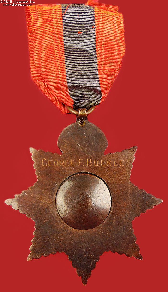 In silver, bronze, enamel, 62.1 mm in height (incl. eyelet), 57.0 mm in width, weighs 37.6 g (incl. ring). Two-part construction with the silver insignia with crown mounted on a silvered bronze star. The center medallion features the royal monogram of George V in blue enamel, encircled by the inscription "FOR FAITHFUL SERVICE", also in blue enamel. Issued to George F. Buckle, whose name is engraved on the reverse. The medal is suspended from a threaded ribbon in moiré silk which appears to be original.