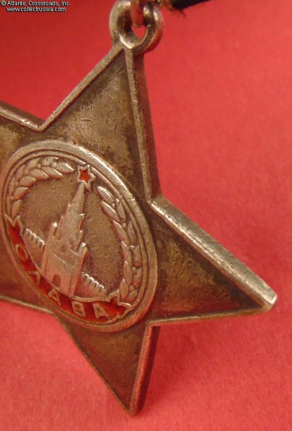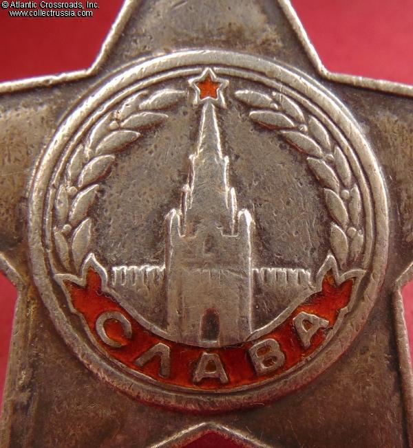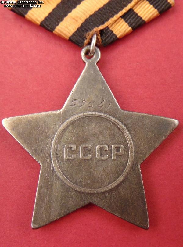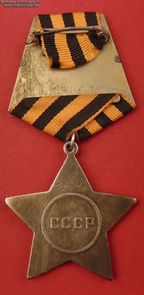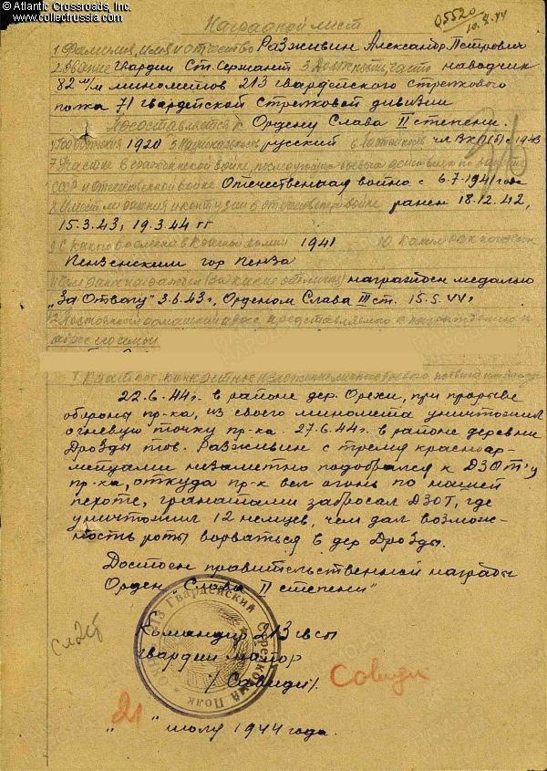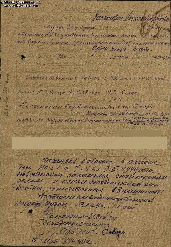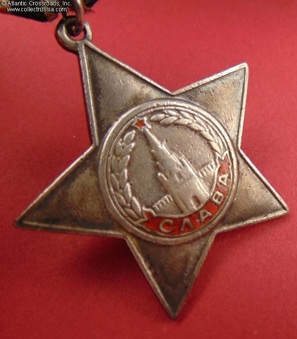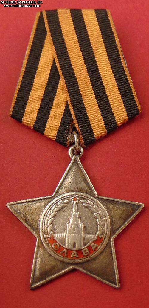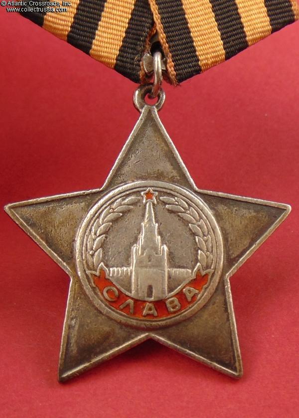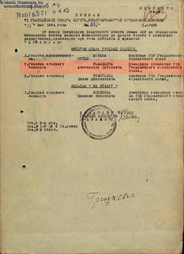 Order of Glory 3rd cl, #59541, awarded on 15 May 1944 to Senior Sergeant Aleksandr Razzhivin (Александр Петрович Разживин), a sniper of the 213th Guards Rifle Regiment, 71st Guards Rifle Division, 23rd Guards Rifle Corps, 6th Guards Army, 1st Baltic Front.