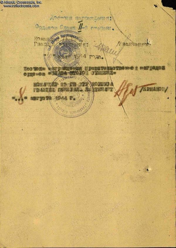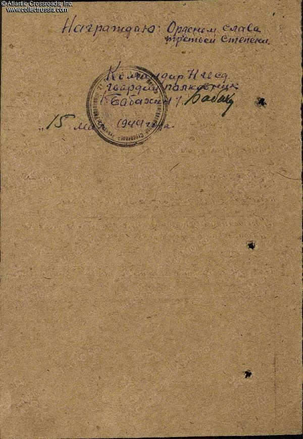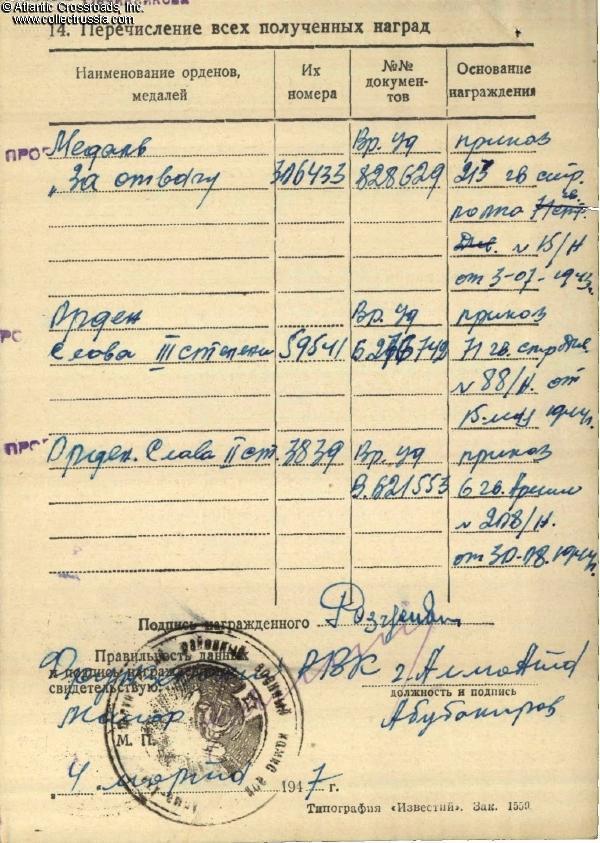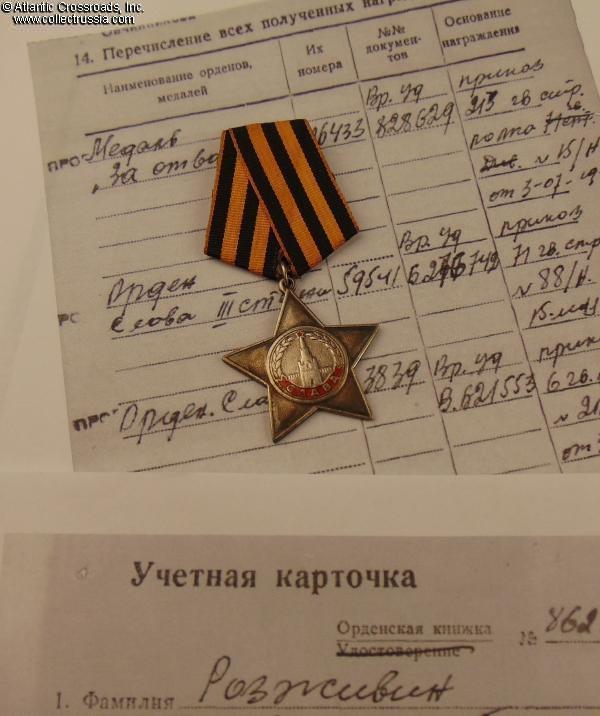 Research Materials: b/w photocopy of the award record card, commendations for all three WW2 decorations, and the award decree for the Order of Glory 3rd cl.
