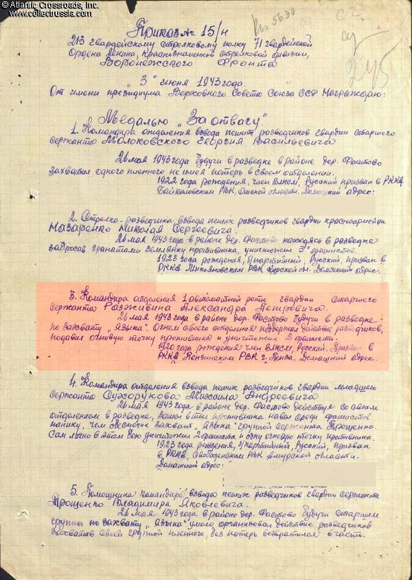 Aleksandr Razzhivin was born in 1920 in a village of Penza Region, about 500 miles southeast of Moscow. He was conscripted into the Red Army in 1940, and was on the front lines of the Patriotic War since its first day, 22 June 1941. In May 1943, Razzhivin's 213th Guards Rifle Regiment of the 71st Guards Rifle Division, 6th Guards Army, then a part of the Voronezh Front, was engaged in the final preparations for the upcoming Battle of Kursk on the southern flank of the salient. A few weeks later, the regiment would stand directly in the path of the attacking German 4th Panzer Army but presently, the front was unusually quiet. Razvhivin was then a squad leader in the 1st submachine gun company. On 26 May, he and his squad were on a recon mission supporting a team tasked with capturing an enemy soldier to interrogate. Razzhivin's squad neutralized an enemy firing position with submachine gun fire, thus providing the recon team an opportunity to complete their task and bring back a captive. For this operation, Razzhivin was recommended for the Medal for Valor, with which he was awarded on 3 July 1943.