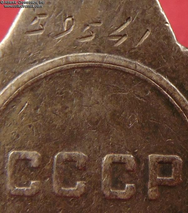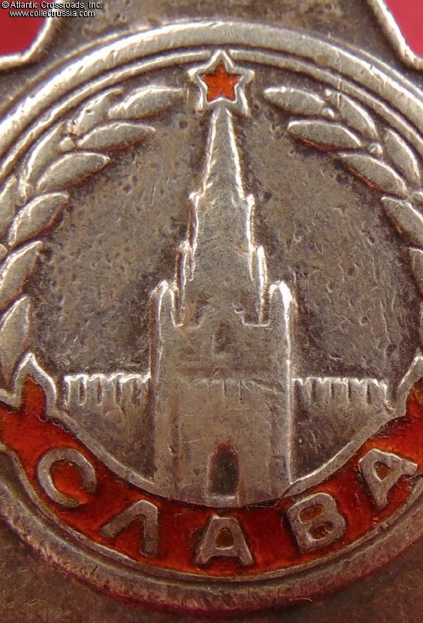 Silver, enamel; measures 48.1 mm in height incl. eyelet, 46.0 mm in width; weighs 24.3 g without suspension and connecting link. Note the low, 5-digit serial number. Features an early version of the medallion with the Kremlin tower touching the edge of the red scroll, arch under the clock without the horizontal bar in its upper portion, and the "windows" on the left and right of the arch having small vertical lines not reaching the bottom of the windows (the latter are admittedly hard to see on this specimen due to wear).