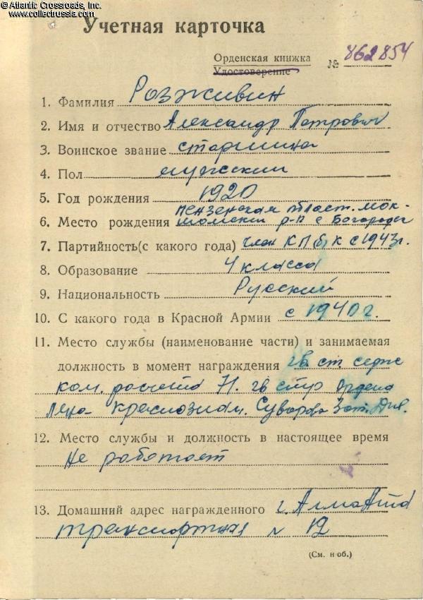 By the end of the Patriotic War, Razzhivin had the rank of Guards Sergeant Major. If he remained on active duty after the war, it was not for long. As of March 1947, when his award record card was filled in, he had moved to Alma-Ata, the capital of Soviet Central Asian republic of Kazakhstan, and was unemployed.