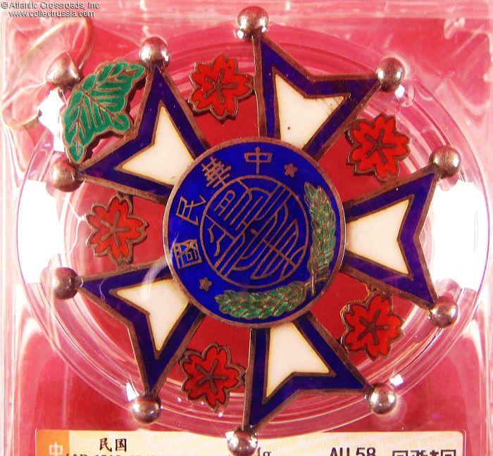 In silver, enamels. Without removing it from its case, we can only approximately measure its size, 59 mm in height (incl. green leaves), 50 mm in width. The certification tag cites its weight as 39.4 g. The hieroglyphics on top of the center medallion read "Republic of China" (another translation we had was "Nation of Central China"). The plum blossoms connecting the five rays symbolize strength in Chinese iconography. The inscription on the tag reads "Blue Medal of the Republic of China." The maker's mark is struck into the reverse near the center, meaning "Manufactu