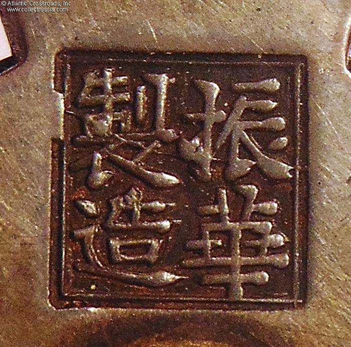 In silver, enamels. Without removing it from its case, we can only approximately measure its size, 59 mm in height (incl. green leaves), 50 mm in width. The certification tag cites its weight as 39.4 g. The hieroglyphics on top of the center medallion read "Republic of China" (another translation we had was "Nation of Central China"). The plum blossoms connecting the five rays symbolize strength in Chinese iconography. The inscription on the tag reads "Blue Medal of the Republic of China." The maker's mark is struck into the reverse near the center, meaning "Manufactured by Zhenhua." As far as we can tell without removing the medal from the case, it is in very fine to excellent condition, showing just minute cracks to the white and blue enamels at the lower prong of the 3 o'clock arm. We captured them on camera as well as we could through the plastic of the case.