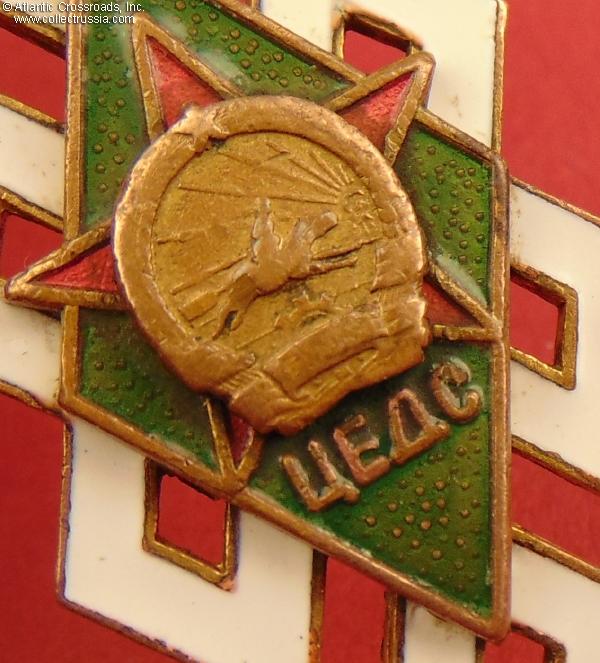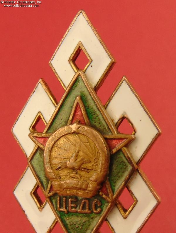 In brass and "cold" enamels, 50.2 x 25.6 mm; three-piece construction. There is a Cyrillic abbreviation ЦЕДС ("TsEDS") under the national emblem. Unlike the civilian college graduation "diamonds", this piece features a red star behind the state emblem.