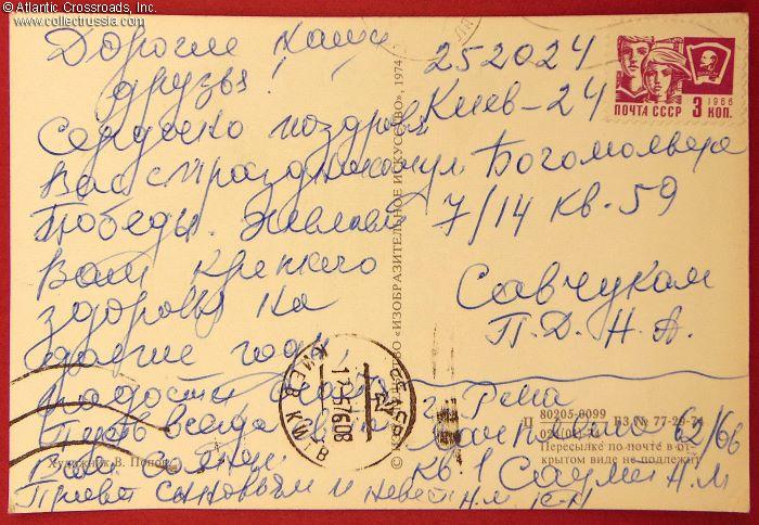 The size is 5 ½" x 3 ½", marked "unmailable without a cover" but postally marked and used. Published by the Visual Art Publishing House, circulation unknown. The artwork on the obverse is a rendition of the monument to the Soviet Warrier-Liberator in Treptower Park, Berlin, Germany. The artist's name, V. Panov, is printed in the lower left-hand corner on the verso. The postcard was sent from Riga, Latvian SSR, to Kiev, Ukrainian SSR. The Latvian postal cancel is visible only partially on top of the divider. The Kiev cancel is clear and legible at the bottom.