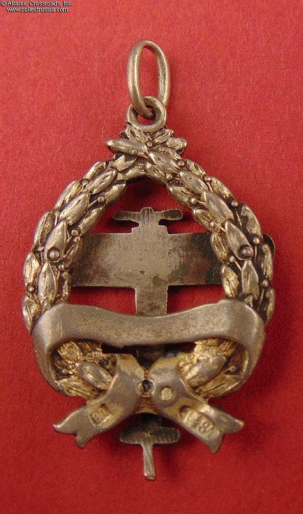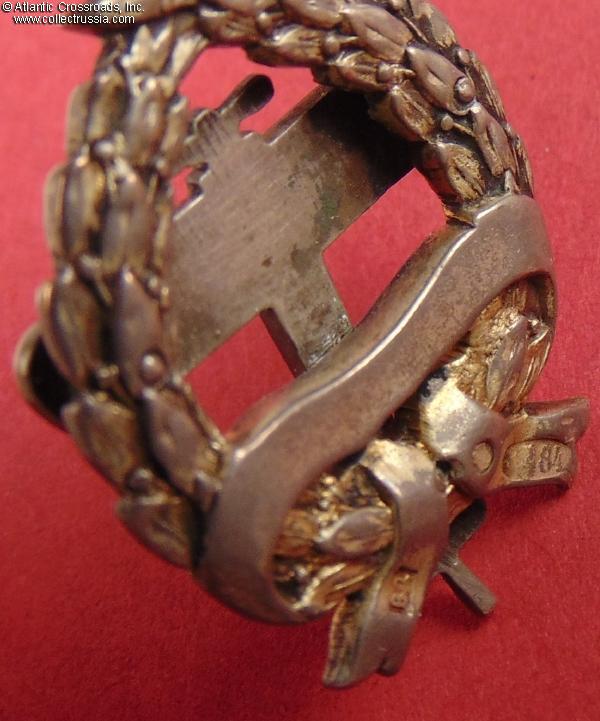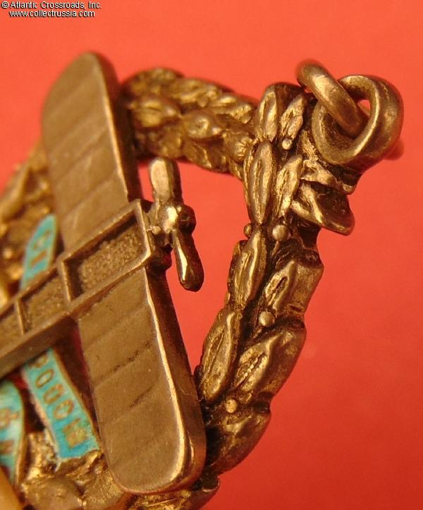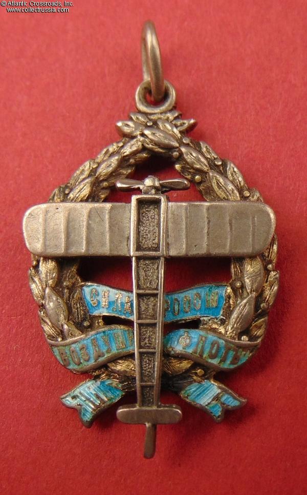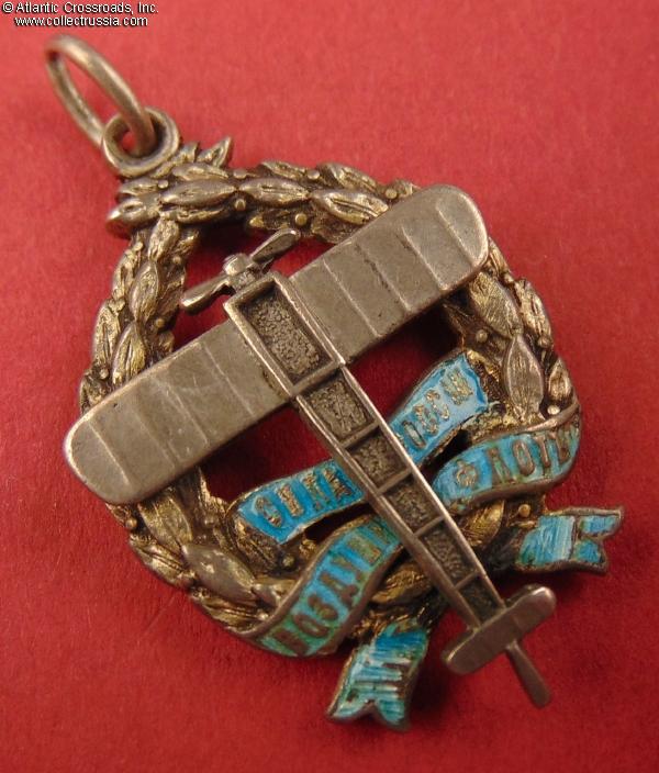 Silver Gilt, Enamel; measures 34.7 mm in height (incl. the eyelet), 22.7 mm in width; weighs 9.2 g not including the connecting loop. The obverse is an overhead view of an early airplane in silver suspended above a silver gilt laurel wreath. The wreath is bound at the bottom with a sky-blue enameled ribbon. The lettering on it reads: "The Strength of Russia is in Her Air Fleet". Reverse of the wreath is as finely detailed as the obverse but the ribbon is not enameled. The ends of the ribbon bear three hallmarks. One is oval with a Kokoshnik lady's head, an "84" silver grade, and