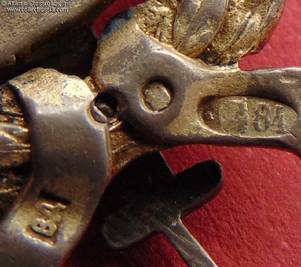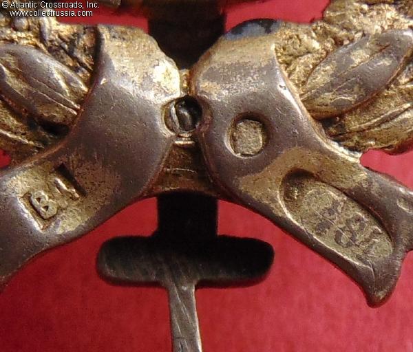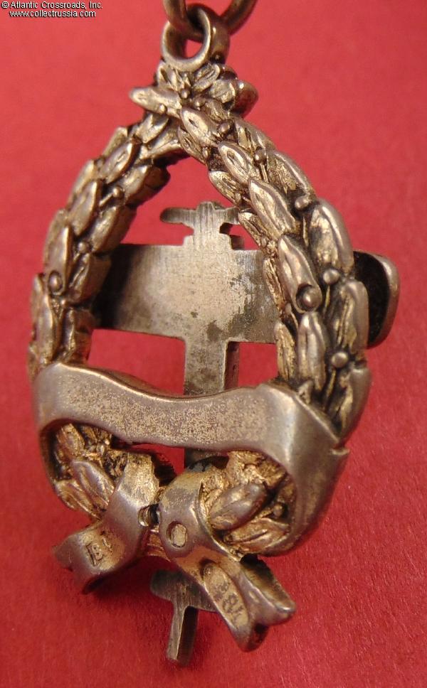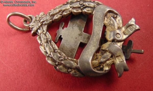 Silver Gilt, Enamel; measures 34.7 mm in height (incl. the eyelet), 22.7 mm in width; weighs 9.2 g not including the connecting loop. The obverse is an overhead view of an early airplane in silver suspended above a silver gilt laurel wreath. The wreath is bound at the bottom with a sky-blue enameled ribbon. The lettering on it reads: "The Strength of Russia is in Her Air Fleet". Reverse of the wreath is as finely detailed as the obverse but the ribbon is not enameled. The ends of the ribbon bear three hallmarks. One is oval with a Kokoshnik lady's head, an "84" silver grade, and the Greek letter Alpha indicating St. Petersburg as the city of manufacture. The second is a Kokoshnik in a circle assayer's hallmark. The third is Cyrillic maker mark "VD" identifying the manufacturer as Eduard (the initials stand for Vera Dietwald, the widow of the original owner of the Eduard firm)