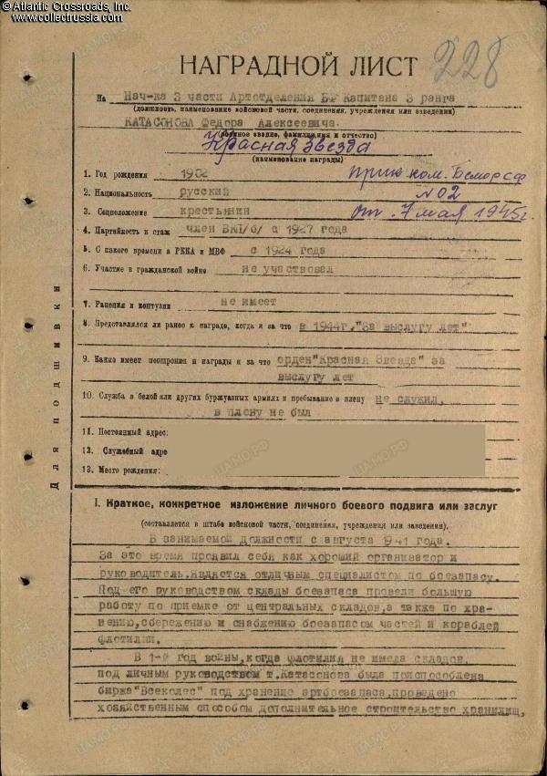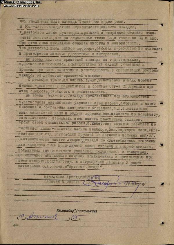 Born in 1902 in a village of the Ryazan province of the Russian Empire, Fyodor Katasonov enlisted in the Soviet Armed Forces in 1924, immediately after the Russian Civil War. A cadre naval officer, he took part in the Patriotic War from starting from August 1941 as the chief of artillery ammunition dumps of the White Sea Flotilla, a part of the Soviet North Fleet based out of Arkhangelsk and chiefly responsible for the protection of the allied northern convoys. In the first year of the war, Katasonov appropriated the timber barge Vsekoles for that purpose, doubling the ammo storage capacity in his care. Throughout the war, he tirelessly and proficiently managed delivery of ammunition to the most remote units of the flotilla as well as the other ships and naval artillery units of the North and Baltic Fleet. When the port of Arkhangelsk came under air attacks, he showed courage and resoluteness in organizing the air defense of the ammunition dumps. Despite his poor health, he constantly demonstrated utmost diligence in his duties through the end of the war.
