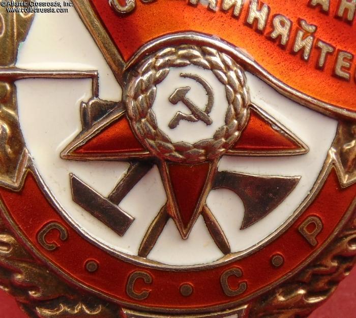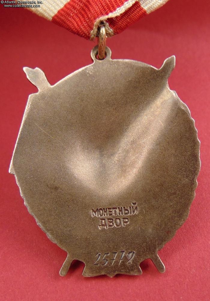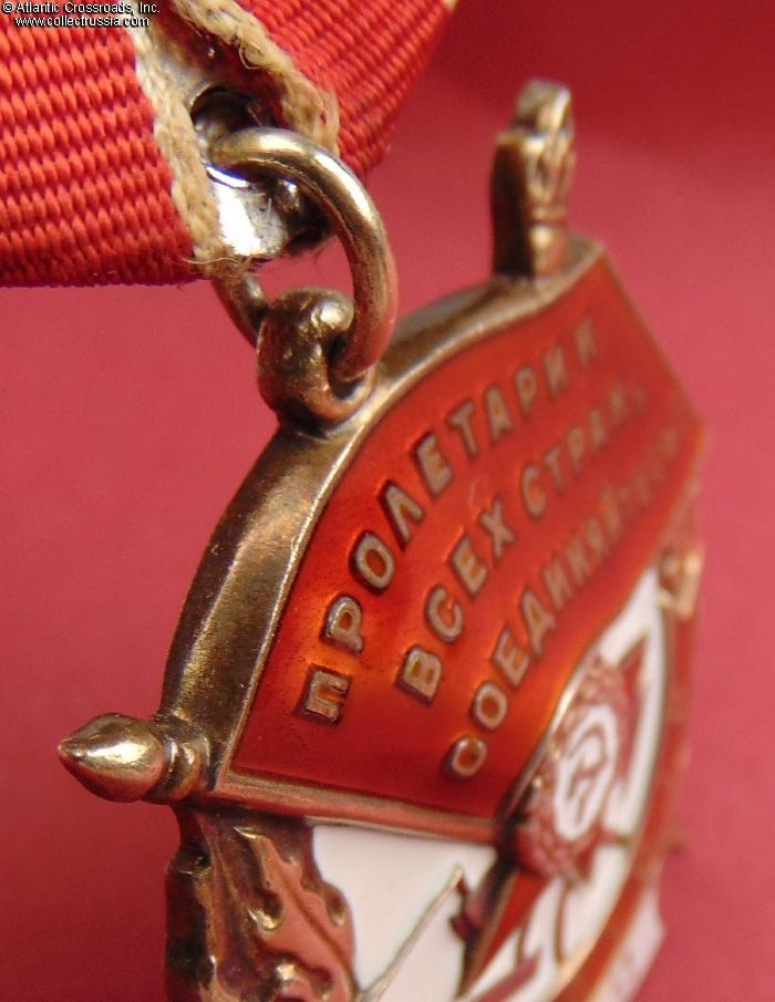 Comes on an original early post-war suspension, a two-layer model in steel with an integral catch of the pin. The ribbon is new. The connecting link appears to be original; its ends are joined with solder in a characteristically seamless manner of the Soviet mint.