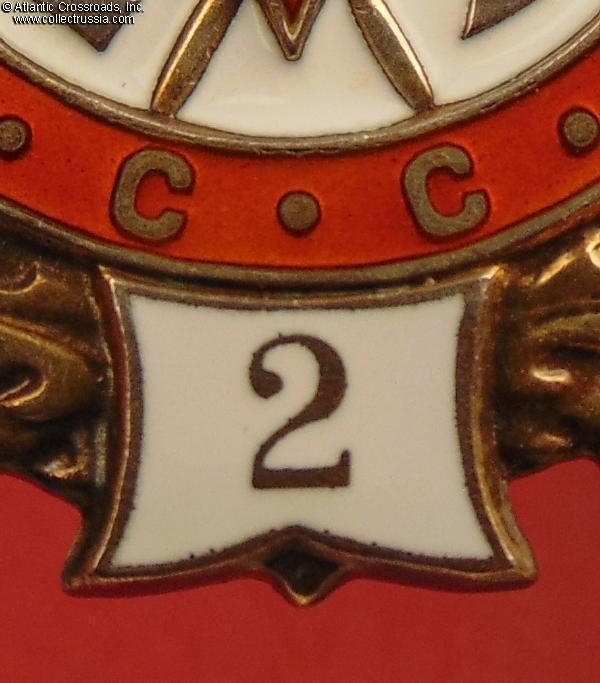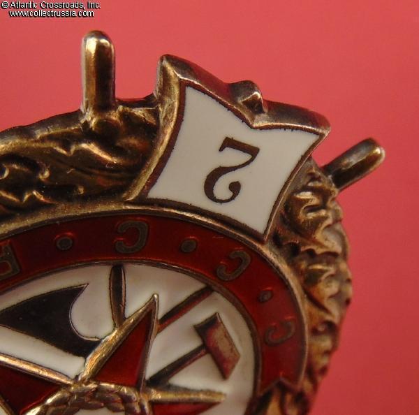 Silver gilt, enamels; measures 44.0 mm in height incl. eyelet, 36.3 mm in width; weighs 24.4 g not including the suspension and connecting link. Produced in 1952 at the Moscow Mint, this version features a relatively small plow and a torch with four flames, including three in the lower row and one, much larger and with a sharp point, at the top. The reverse is relatively smooth with a shallow rounded depression in the center. The mint mark is in two straight lines.