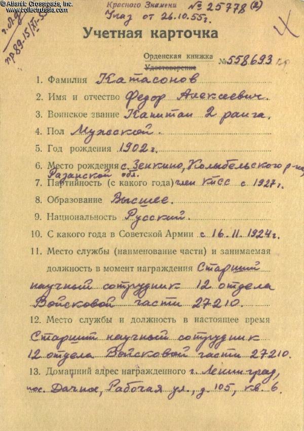 In recognition of his tireless service, Katasonov, then a captain 3rd cl., was awarded with the Order of the Red Star on 7 May 1945, the day Nazi Germany surrendered to the allies. He also received a number of decorations for length of service: Order of the Red Star in Nov. 1944; Order of the Red Banner in April 1945; Order of Lenin in Nov. 1950; and Order of the Red Banner, 2nd award (#25778) in Oct. 1955. He remained on active duty at least through November 1955, at which point he had the rank of Captain 2nd cl. (equivalent to US Navy Commander) and was a senior scientist of the Military Unit #27210.