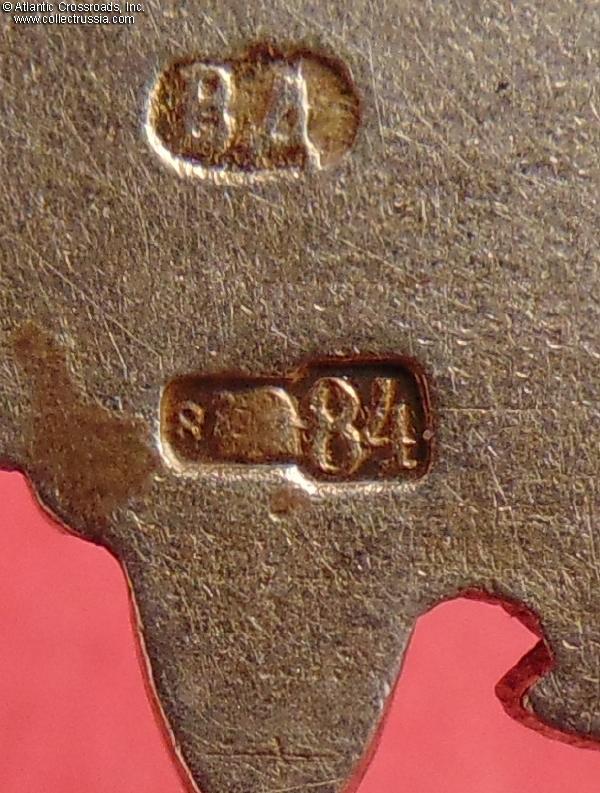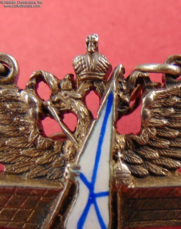 This version of the Air Force donation jetton has long chains specifically to be worn hooked over a suit or uniform button. The artwork features the imperial eagle lifting an early monoplane and flag into the sky. The flag may seem like a regular Russian St. Andrew's naval flag at first glance but it has an interesting feature: an additional short vertical blue line symbolizing the fifth, i.e. "aerial ocean". There are two hallmarks o