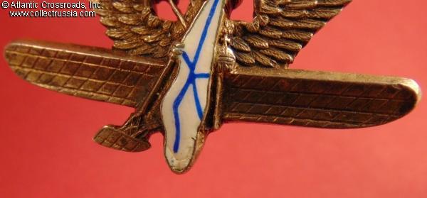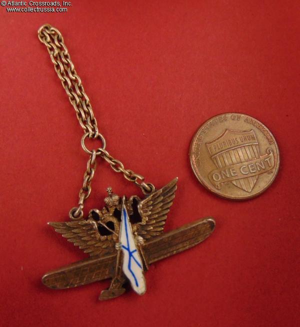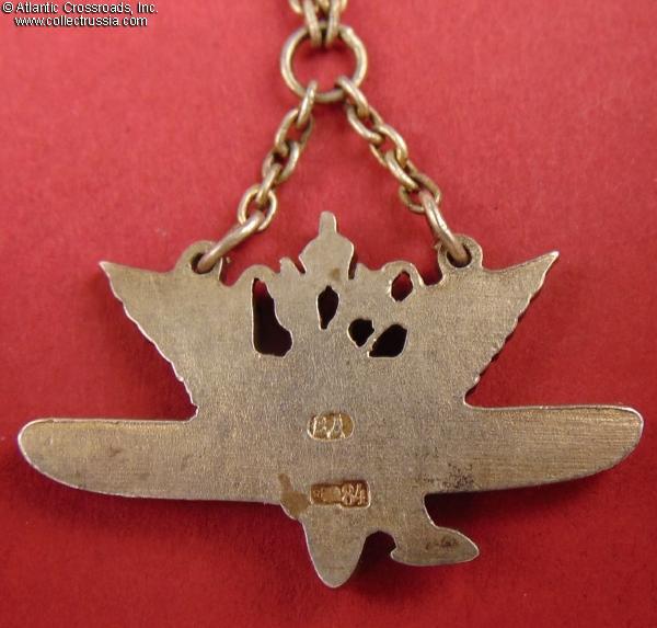 This version of the Air Force donation jetton has long chains specifically to be worn hooked over a suit or uniform button. The artwork features the imperial eagle lifting an early monoplane and flag into the sky. The flag may seem like a regular Russian St. Andrew's naval flag at first glance but it has an interesting feature: an additional short vertical blue line symbolizing the fifth, i.e. "aerial ocean". There are two hallmarks on the reverse: a "Kokoshnik" lady's head "84" silver hallmark with Greek letter Alpha, the designation of the St. Petersburg assay inspection; and Cyrillic letters BД ("VD") of the Eduard jewelry firm (the initials stand for Vera Dietwald, the widow of the original owner of the firm).